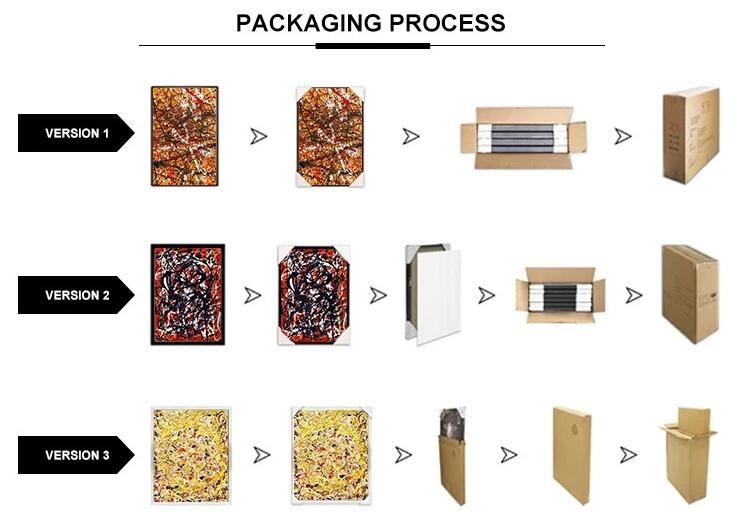 | Package preview: | Packaging Details: | (1) Canvas Only: Shrink Film + Roll (2) Stretch Ready to Hang: Canvas + Frame + Wrap + Shrink Film + 4 Corner Protection + Hanging System (3) Framed Painting: About 5/10pcs in a carton, Based on the actual situation (4) can be customized packaging | |