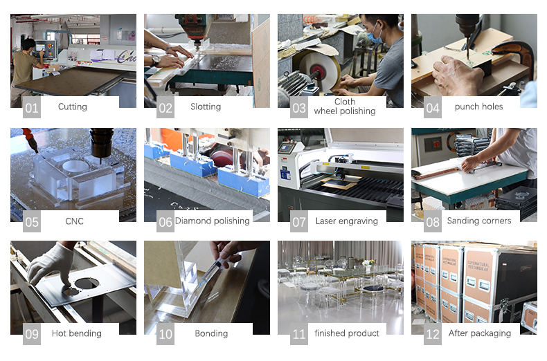 A: Yes, we are factory. We have been engaged in the acrylic industry for more than 10 years, but our original workshop was specialized in producing acrylic display stands and advertising signs. Now our goal is to develop a full range of acrylic products, not only display stands and signs, but also customized products according to customers' requirements. Required to develop a furniture range. 'And the different requirements of the market. Now our production line adopts the latest machinery.