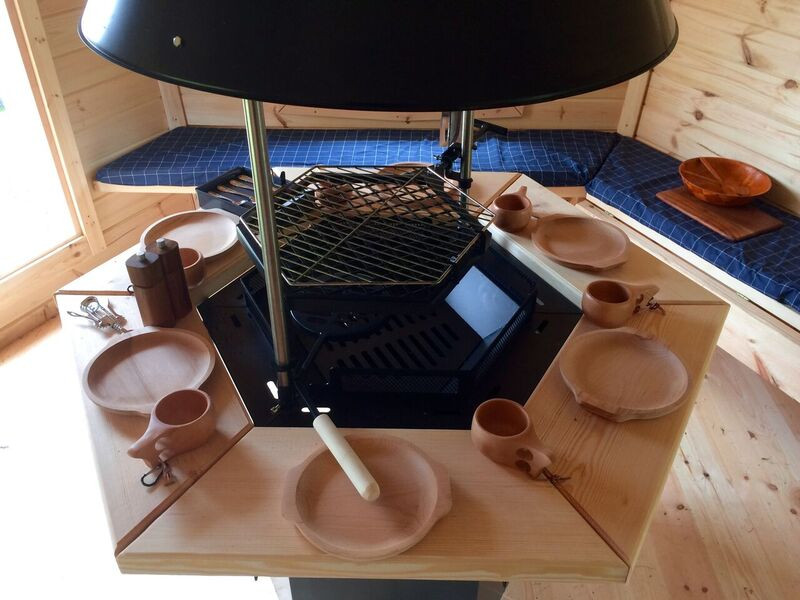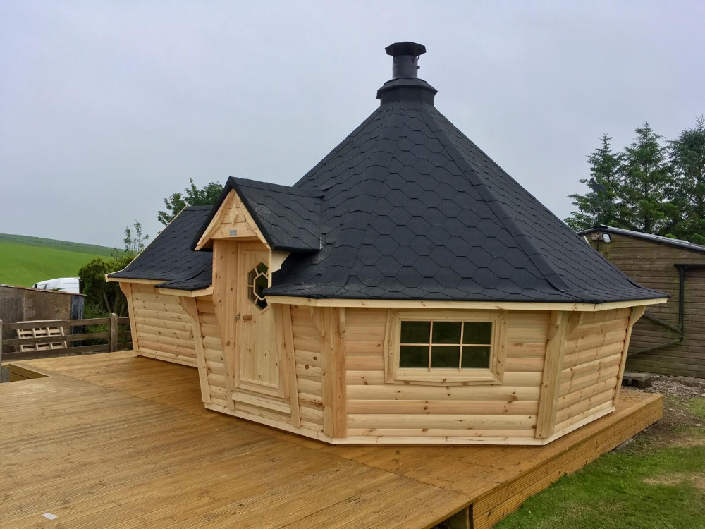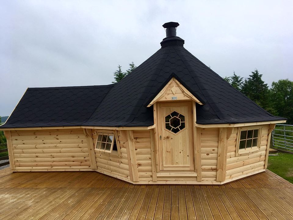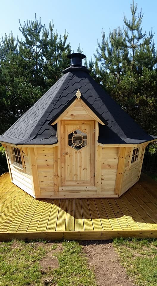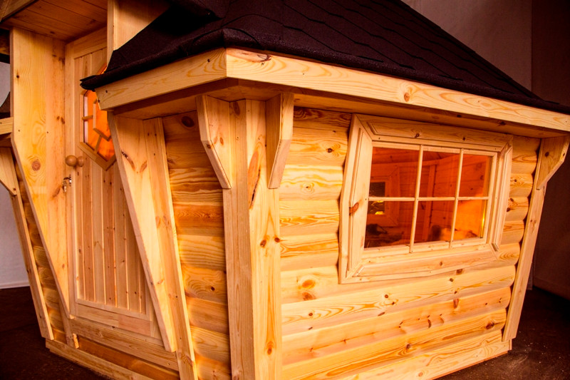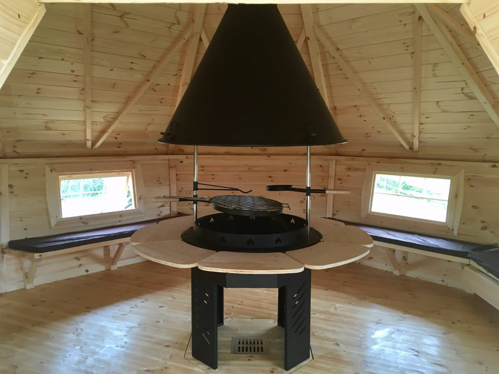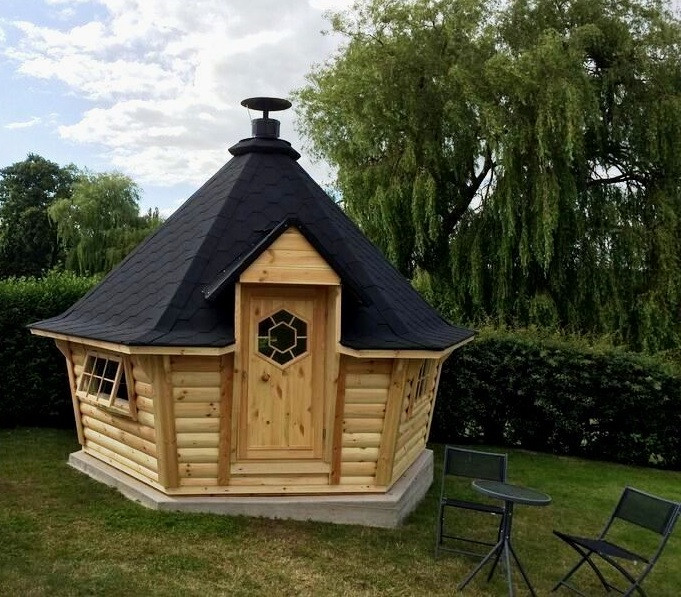 Standard BBQ Hut kits come with 45mm straight walls, 18mm thick freestanding floor and roof panels. The package also includes double glazed openings and fixed windows, pine doors, standard hexagonal or octagonal barbecue grill (depending on cabin size selected), surrounded by wooden tables, retractable chimneys, wooden benches and seat cushions.