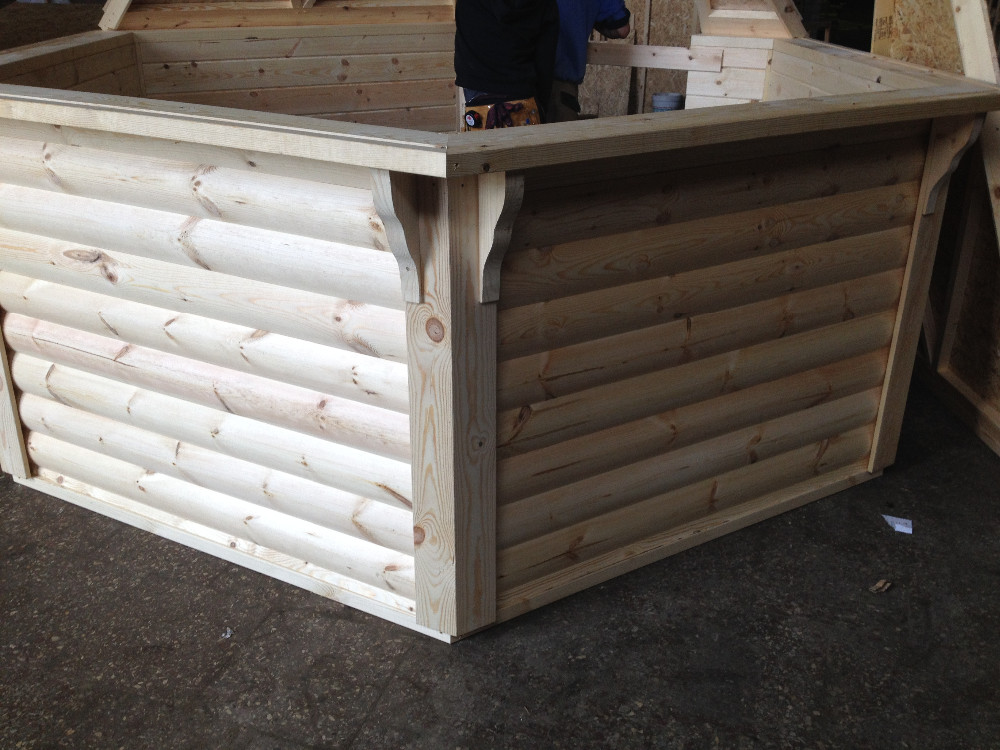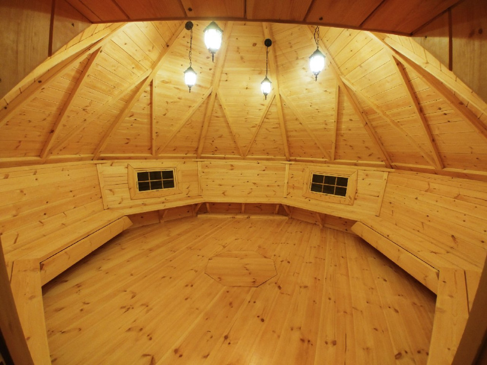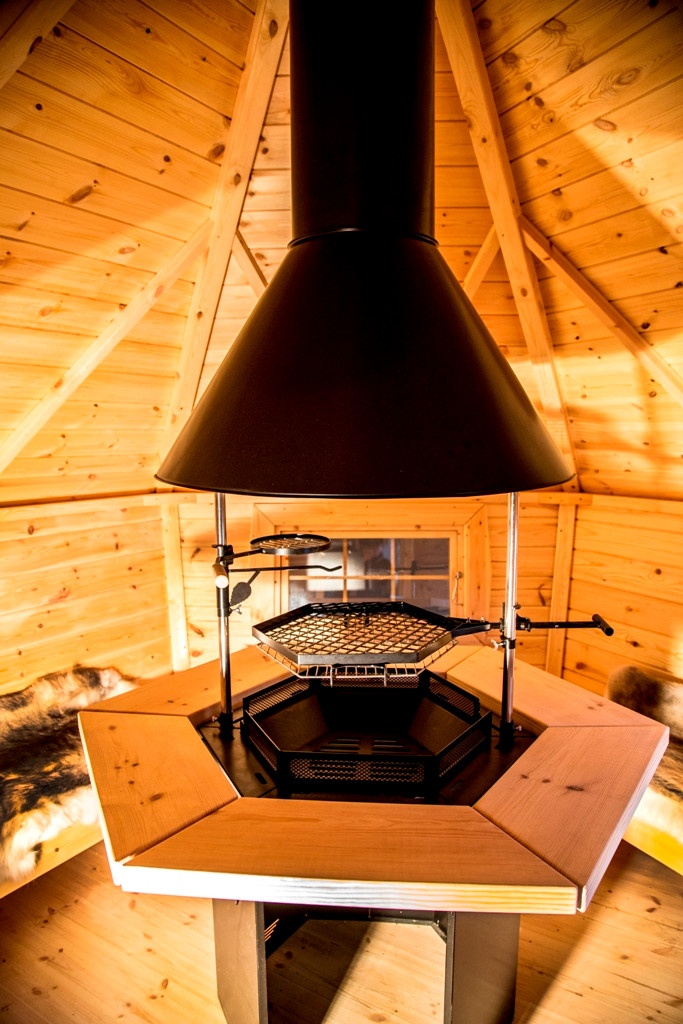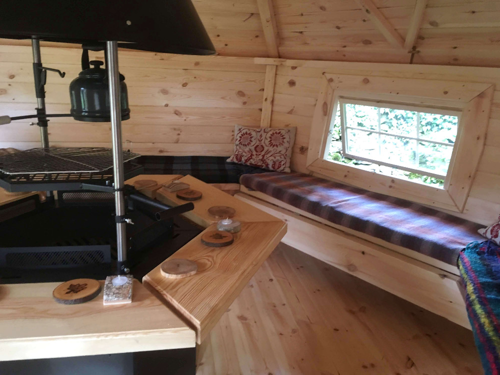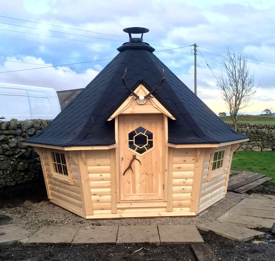 Standard BBQ Hut kits come with 45mm straight walls, 18mm thick freestanding floor and roof panels. The package also includes double glazed openings and fixed windows, pine doors, standard hexagonal or octagonal barbecue grill (depending on cabin size selected), surrounded by wooden tables, retractable chimneys, wooden benches and seat cushions.