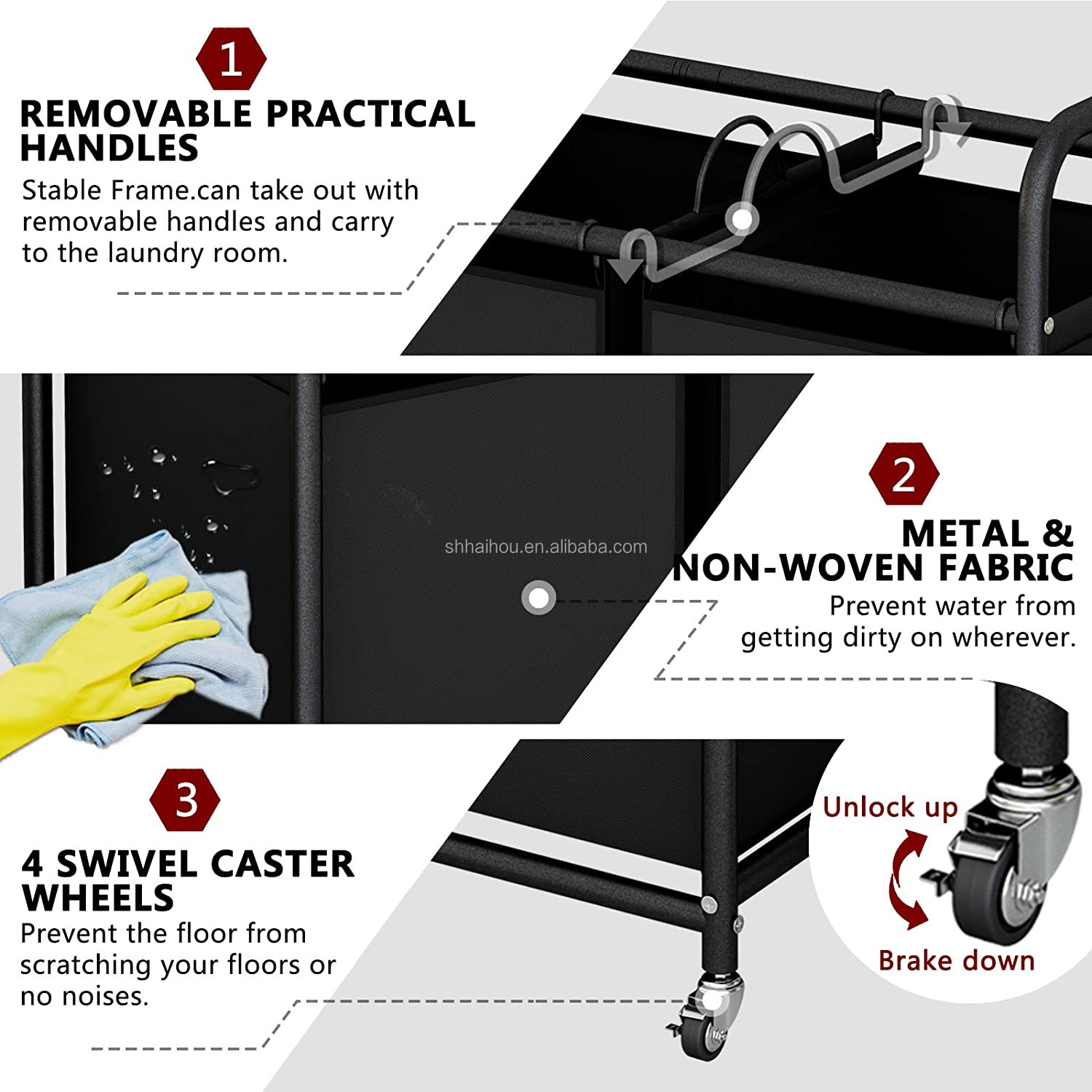Extremely sturdy metal frame wheeled foldable 3-compartment triple laundry sorter.