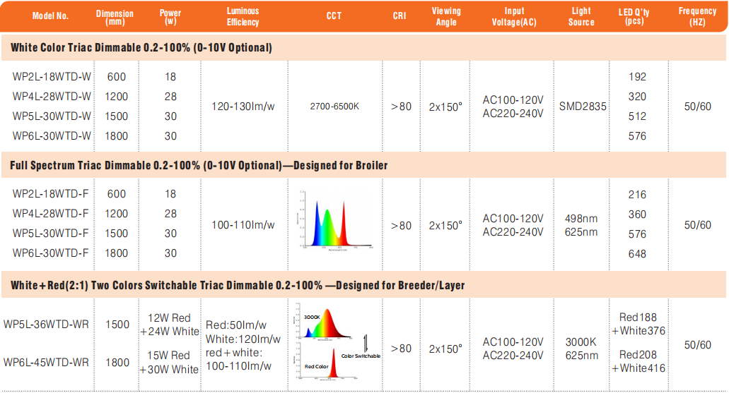 Certification: CE, ETL, RoHS, SAA Working temperature(℃): -20 - 40 application: Poultry, pigs, cattle houses port: Yantian Port model: WP2L-18WTD-W Lifespan (hours): 80000 Luminous color: changeable Supported: OEM, design and manufacture Supported dimmers: Yes cover: frosted, transparent Color...... -